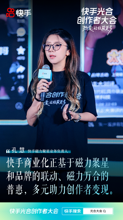 8月10日,2023快手光合創(chuàng)作者大會在上海召開,大會以“熱愛,讓收獲更多”為主題,重磅發(fā)布了創(chuàng)作者服務戰(zhàn)略,全面賦能創(chuàng)作者成長與變現(xiàn)。會上,快手磁力聚星業(yè)務負責人孔慧從“商業(yè)助力創(chuàng)作者變現(xiàn)”的角度,分享了商業(yè)化通過磁力聚星、磁力萬合、營銷活動等,全方位、多元化助力創(chuàng)作者實現(xiàn)更高效地成長與變現(xiàn)的成績與規(guī)劃。