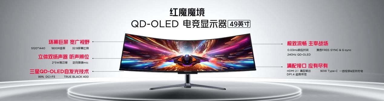 而想要獲得更加震撼視效體驗,高素質(zhì)超大屏顯示器必不可少。紅魔魔境·QD-OLED電競顯示器 49英寸版采用了三星量子點OLED面板,在分辨率、對比度、可視角度等方面,都代表了OLED的最高水平,屏幕比例32:9,曲率1800R,同時配備240Hz的高刷新率,為玩家?guī)砣骓敻竦某两酱笃岭姼傮w驗。魔境 49寸,QD-OLED電競顯示器售價9499元,首發(fā)嘗鮮價8999元!
