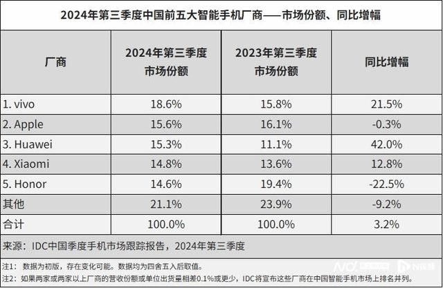 IDC數據顯示,2024年Q3,中國市場出貨量排名Top5的品牌中,有兩個品牌出貨量下滑,三個品牌出貨量保持增長。其中,2024年Q3蘋果市場份額為15.6%,出貨量同比下滑0.3%;榮耀市場份額為14.6%,同比下滑22.5%。