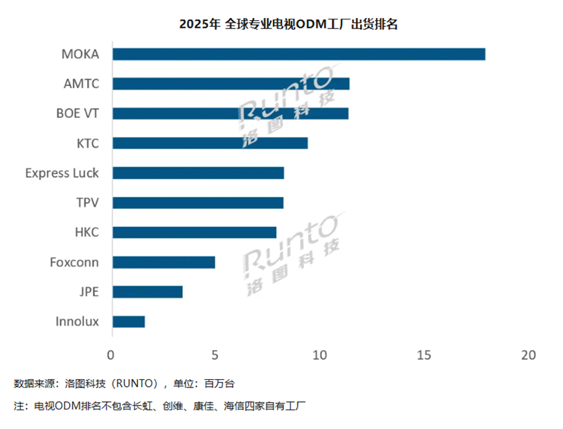 在代工廠格局方面,2025年出現(xiàn)明顯分化。釘科技注意到,擁有面板資源的企業(yè)占據(jù)了明顯優(yōu)勢。茂佳(MOKA)2025年出貨量約為1790萬臺(tái),同比2024年增長6.9%,領(lǐng)先優(yōu)勢高達(dá)約600萬臺(tái),連續(xù)第三年奪得總量冠軍,展現(xiàn)其規(guī)模與交付能力的穩(wěn)定性。而BOE VT(京東方視訊)則以高達(dá)37.5%的顯著增速成為年度“增長冠軍”,顯示其在客戶拓展與產(chǎn)能釋放上的強(qiáng)勁動(dòng)力。