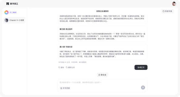 更重要的是,還能幫創(chuàng)作者解決小說“斷更”的困擾。當創(chuàng)作卡文時,創(chuàng)作者只需將腦海中的劇情構思告知「Chapter X」,便能直接生成文章片段來驗證想法,從而更高效、輕松地完成續(xù)寫,快速更新作品。