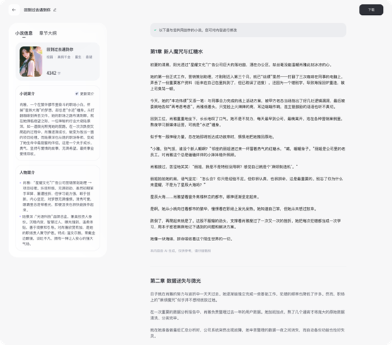 例如,用戶輸入“幫我寫一篇小說,題材為校園,角色是青梅竹馬,劇情是歡喜冤家天作之合”。系統便能生成包括世界觀設定、角色關系、主線劇情和章節(jié)內容的完整小說。
