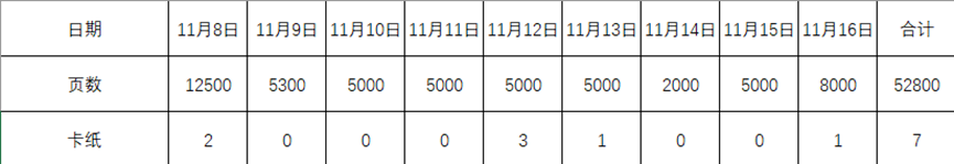 通過(guò)上表我們可以看到,在11月8日到11月16日為期9天的測(cè)試中,我們共打印了52800頁(yè)標(biāo)準(zhǔn)測(cè)試文檔,其中共出現(xiàn)過(guò)7次卡紙報(bào)錯(cuò)情況。