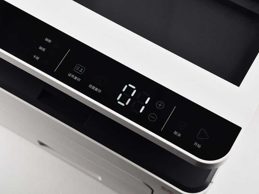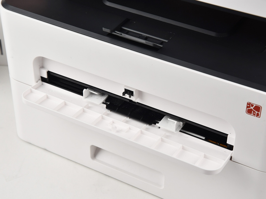 在機(jī)身中部為該產(chǎn)品的出紙單元,因采用了黑色配色,讓用戶可以很好的識(shí)別出打印文檔,較大概率上避免了打印后錯(cuò)拿忘拿的可能性。