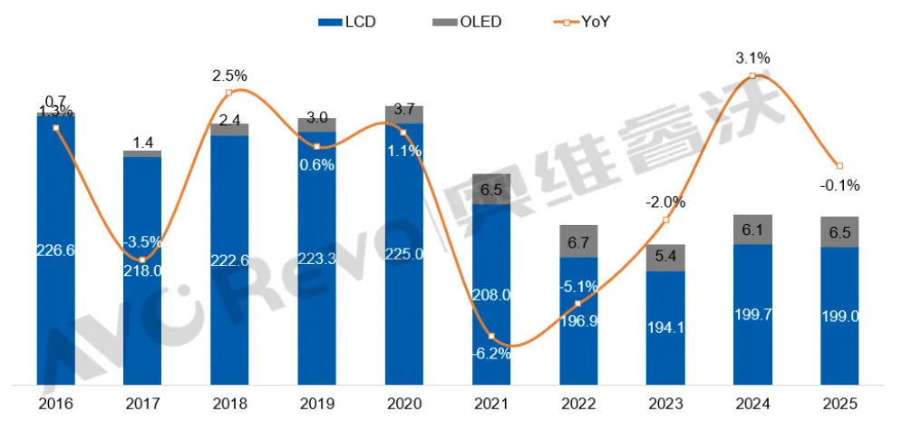 2016-2025年全球TV出貨量與同比