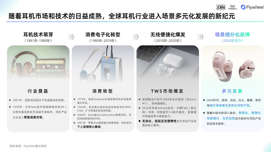 縱觀全球耳機行業(yè)百年發(fā)展,其演進脈絡(luò)清晰可見:從技術(shù)萌芽期的專業(yè)工具,逐步轉(zhuǎn)型為大眾消費電子品類,并在近十年迎來無線化爆發(fā)與場景化延伸。