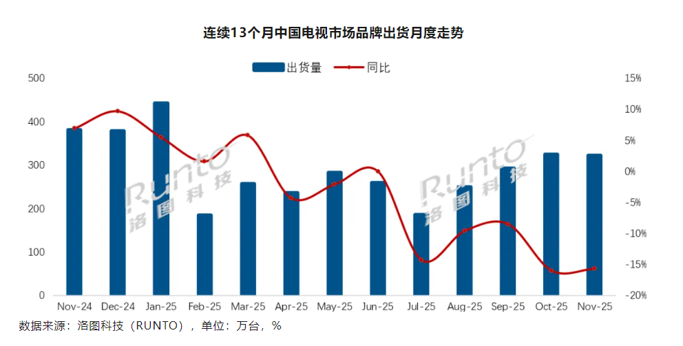 2025年11月,中國電視市場延續(xù)下半年以來的衰退態(tài)勢,即便疊加史上啟動最早、周期最長的雙十一大促,仍未能扭轉(zhuǎn)需求疲軟的核心困境。洛圖科技(RUNTO)發(fā)布的月度數(shù)據(jù)顯示,當(dāng)月電視市場品牌整機出貨量約322萬臺,環(huán)比10月略微下降,較去年同期大幅下滑15.7%,行業(yè)下行壓力進(jìn)一步加劇。