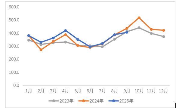 2023年-2025年9月洗衣機行業(yè)出口月度季節(jié)特征(萬臺)