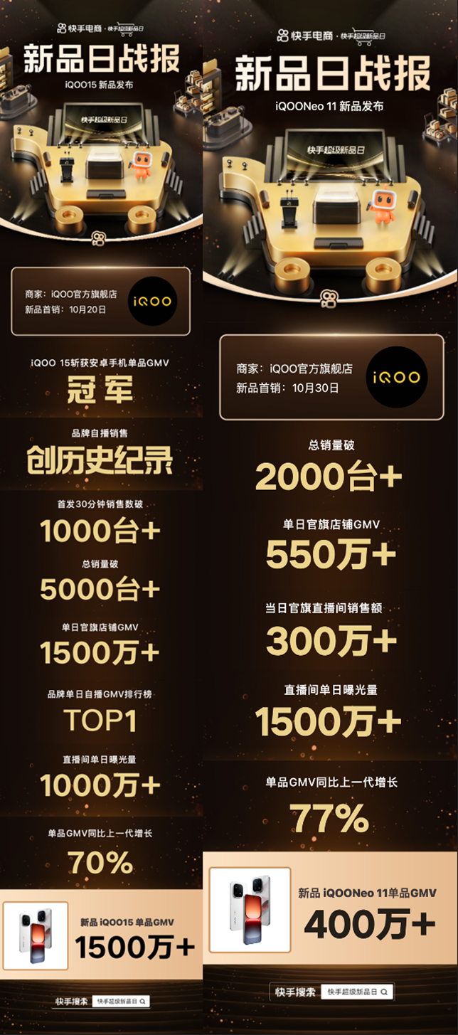 而在以“超長(zhǎng)直播+超值福利”撬動(dòng)轉(zhuǎn)化的同時(shí),“快手超級(jí)新品日”IP也通過(guò)短視頻作品日推、直播推廣等資源扶持,快速引爆新品內(nèi)容熱度和用戶消費(fèi)心智。同時(shí),快手搜索結(jié)果頁(yè)、快手日榜等多個(gè)快手站內(nèi)資源的投放,也助力品牌高效觸達(dá)更多人群,將產(chǎn)品高熱聲量轉(zhuǎn)化為熱賣(mài)銷(xiāo)量。10月20日iQOO 15首銷(xiāo)大場(chǎng)直播間單日曝光量超1000萬(wàn);10月30日Neo 11首銷(xiāo)大場(chǎng),直播間單日曝光量超1500萬(wàn)。