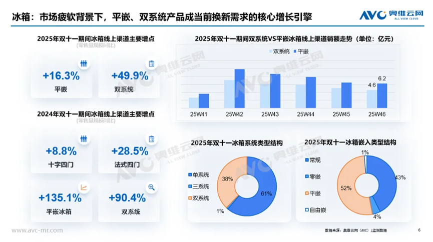 冰箱領(lǐng)域則呈現(xiàn)雙重突破。釘科技注意到,雙系統(tǒng)產(chǎn)品通過精準(zhǔn)溫區(qū)控制滿足食材保鮮細(xì)分需求,而平嵌設(shè)計(jì)則以無邊界美學(xué)打破傳統(tǒng)冰箱的空間局限,兩者分別實(shí)現(xiàn)49.9%和16%的同比增長(zhǎng)。