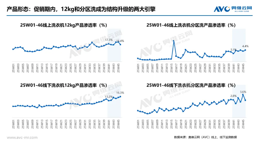 洗護(hù)品類中,多筒分區(qū)洗洗衣機(jī)展現(xiàn)出明顯優(yōu)勢(shì)。釘科技注意到,雙十一期間,12kg大容量與分區(qū)洗功能滲透率顯著提升,以統(tǒng)帥、美的、小米為代表的"三區(qū)洗"一體化產(chǎn)品競(jìng)爭(zhēng)尤為激烈。值得注意的是,中高端價(jià)格帶(4000-6000元)的滲透率持續(xù)攀升,反映出消費(fèi)者愿意為功能細(xì)分和效率提升支付溢價(jià)。這種結(jié)構(gòu)性增長(zhǎng)不僅體現(xiàn)在產(chǎn)品層面,更倒逼產(chǎn)業(yè)鏈在智能制造、場(chǎng)景化服務(wù)等領(lǐng)域加速布局。
