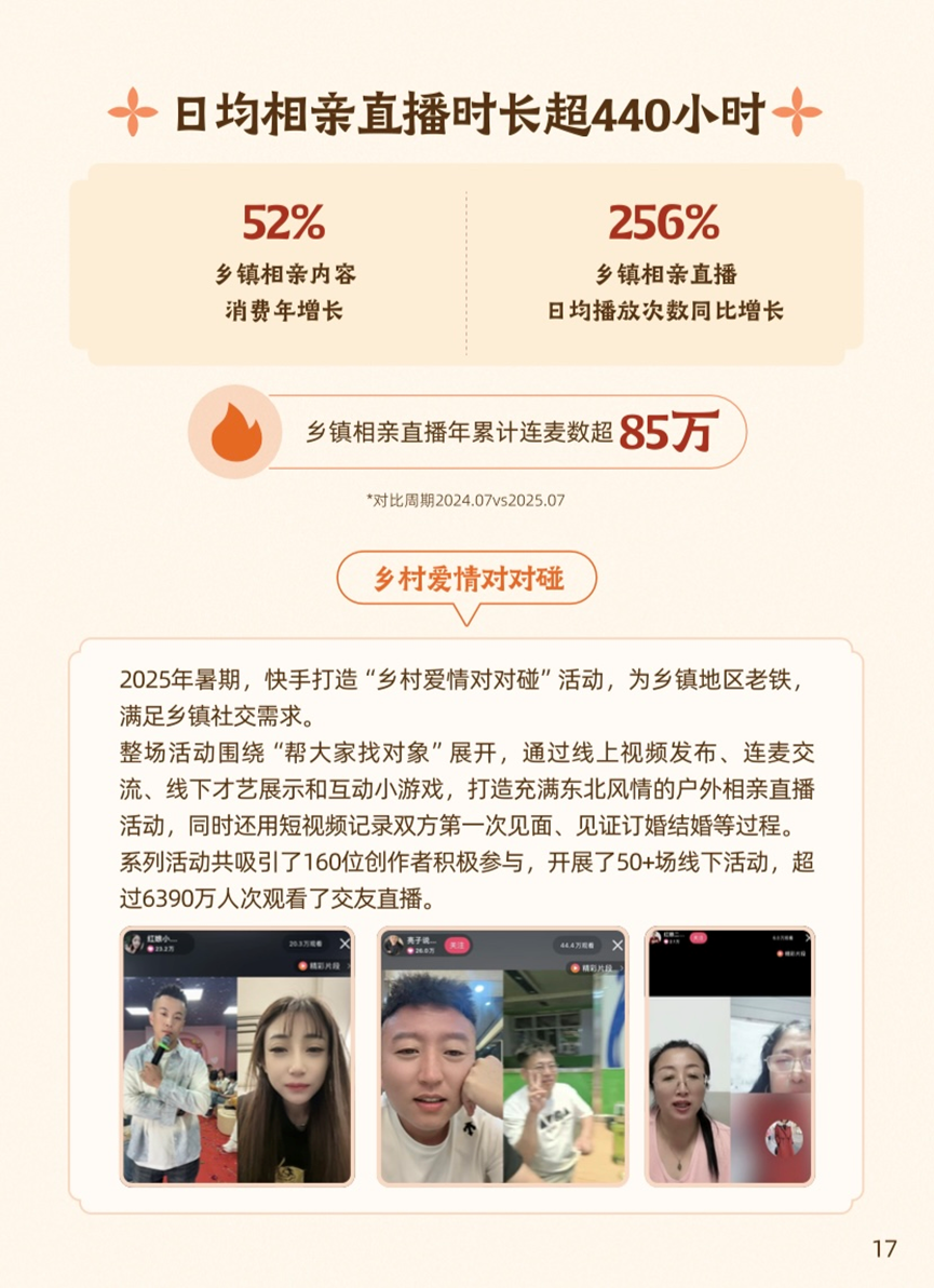 在快手上,老鐵們不僅擁有自己的村口舞臺,也拓展著線上的“鄉(xiāng)村愛情”。建立在深厚信任基礎(chǔ)上的快手新農(nóng)人社區(qū),為直播相親提供了天然優(yōu)勢,真實互動有效提升了相親成功率。報告顯示,過去一年快手上日均相親直播時長超過440小時,鄉(xiāng)鎮(zhèn)用戶對相親內(nèi)容的消費量年增長達52%。2025年暑期,快手打造的“鄉(xiāng)村愛情對對碰”活動,精準對接鄉(xiāng)鎮(zhèn)用戶的社交需求,共舉辦超過50場線下活動,累計吸引觀看人次超6390萬。