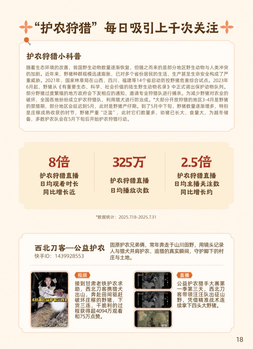 為減少野豬對農(nóng)業(yè)的破壞,全國各地紛紛成立護農(nóng)狩獵隊,他們通過直播的形式記錄每一次的守護行動,每日吸引上千次關(guān)注。報告提到,過去一年,快手上的“護農(nóng)狩獵”直播日均觀看時長同比增長近8倍,日均播放次數(shù)325萬。@西北刀客—公益護農(nóng) @戶外戰(zhàn)隊阿勇 @西北老王 等護農(nóng)狩獵主播攜“汪汪隊”出征山野,守護腳下的村莊與土地的同時,也收獲了大量粉絲。