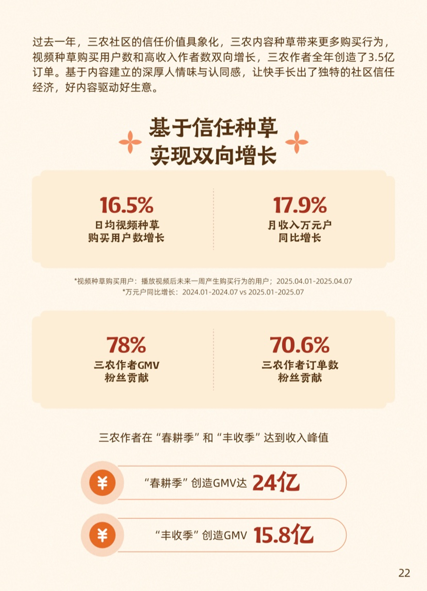 在快手三農(nóng)社區(qū),基于內(nèi)容所建立的人情味與認同感,逐漸孕育出獨特的“社區(qū)信任經(jīng)濟”。過去一年,平臺三農(nóng)作者共產(chǎn)生3.5億筆訂單,用戶通過視頻“種草”下單的規(guī)模持續(xù)擴大,日均視頻種草購買用戶數(shù)增長16.5%,月入過萬的創(chuàng)作者數(shù)量也同步提升17.9%。尤為值得注意的是,三農(nóng)創(chuàng)作者總GMV中有78%由粉絲貢獻——信任,這一傳統(tǒng)商業(yè)中難以量化的要素,在此已成為實實在在的“增收密碼”。