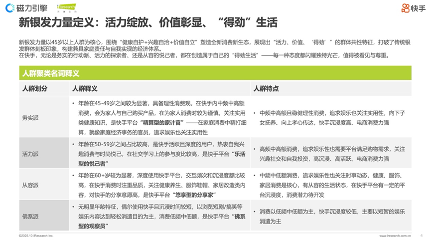近日,快手磁力引擎聯(lián)合艾瑞咨詢發(fā)布《2025快手新銀發(fā)人群洞察報(bào)告》(以下簡(jiǎn)稱“報(bào)告”),揭示了“新銀發(fā)”群體如何以“得勁”為生活哲學(xué),驅(qū)動(dòng)著萬億級(jí)的消費(fèi)市場(chǎng)變革。