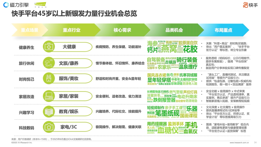從消費(fèi)決策鏈路來看,新銀發(fā)人群重點(diǎn)關(guān)注的是內(nèi)容吸引、決策安全、高性價(jià)比和品質(zhì)體驗(yàn)。而在消費(fèi)品類選擇上,他們更關(guān)注“實(shí)用品質(zhì)與情感價(jià)值”,催生出健康養(yǎng)生、旅游休閑、時(shí)尚悅己、家居改造、興趣學(xué)習(xí)、科技數(shù)碼等高潛力賽道。