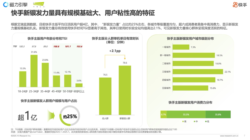 報(bào)告顯示,快手新銀發(fā)用戶規(guī)?;A(chǔ)大、粘性高,快手主版“新銀發(fā)人群”(45歲+)規(guī)模超1億,在總用戶中占比約25%,近七成月均22天以上使用快手,單日使用時(shí)長較全站均值高出2.1%。