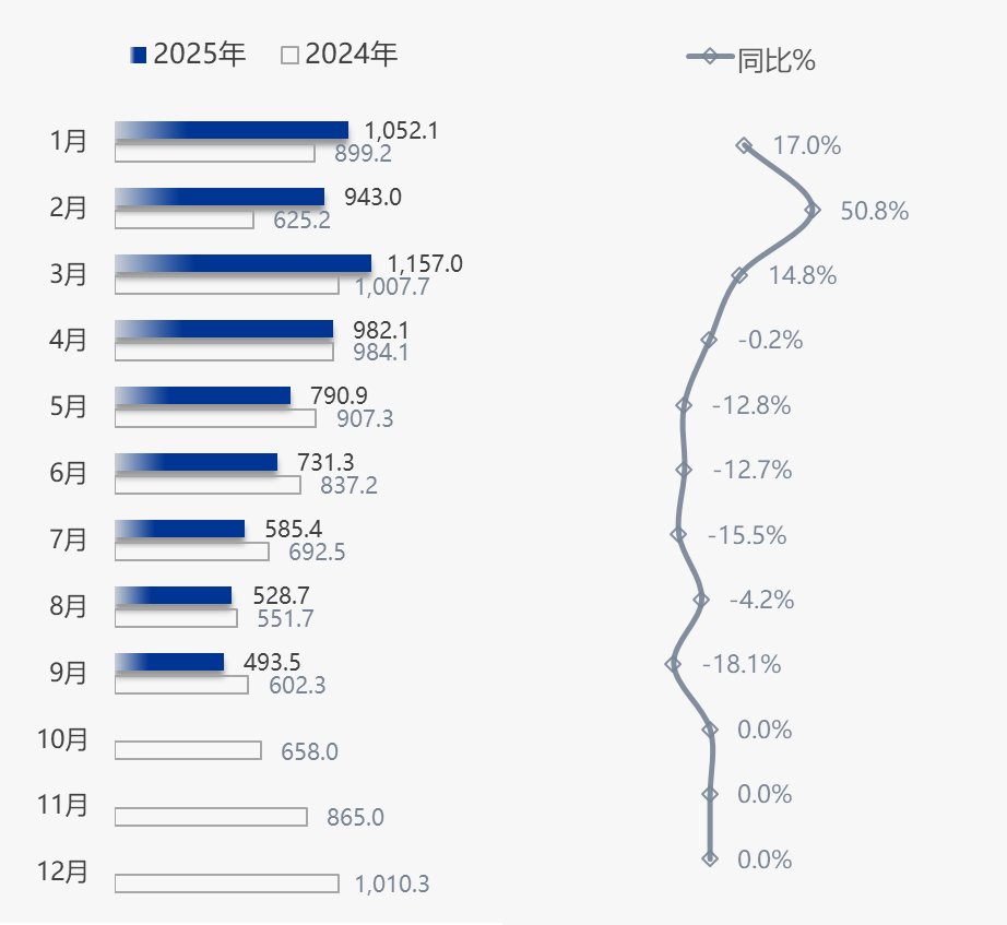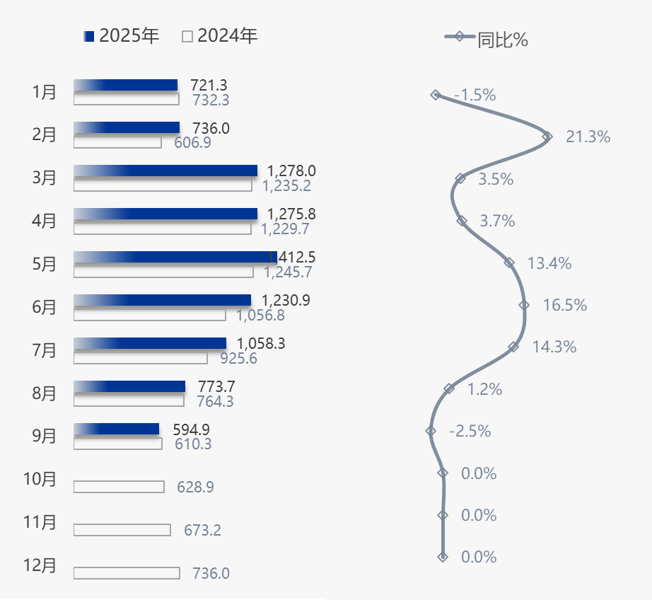 據(jù)產(chǎn)業(yè)在線監(jiān)測數(shù)據(jù)顯示,2025年9月中國家用空調(diào)生產(chǎn)1056.7萬臺,同比下滑13.5%,銷售1088.4萬臺,同比下滑10.2%,其中內(nèi)銷規(guī)模594.9萬臺,同比下滑2.5%