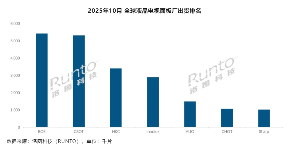 具體來看:10月全球液晶電視面板出貨量達(dá)20.6M片,同比增長8.0%;出貨面積15.1M平方米,同比增長4.5%。在頭部企業(yè)表現(xiàn)上,七家主要面板廠僅彩虹光電出貨量同比微降,其余六家均實(shí)現(xiàn)不同程度增長。其中,華星光電連續(xù)四個(gè)月同比大幅增長超20%,10月增幅更是突破50%,蟬聯(lián)行業(yè)增速第一。