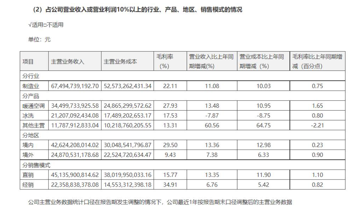 分產(chǎn)品看,暖通空調(diào)業(yè)務(wù)實(shí)現(xiàn)主營業(yè)務(wù)收入345.00億元,同比增長13.48%;冰洗業(yè)務(wù)實(shí)現(xiàn)主營業(yè)務(wù)收入212.07億元,同比下降7.87%;三電公司實(shí)現(xiàn)營業(yè)收入人民幣90.55億元,實(shí)現(xiàn)利潤大幅減虧。