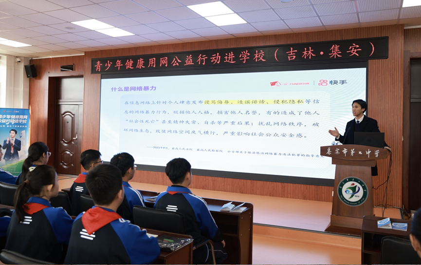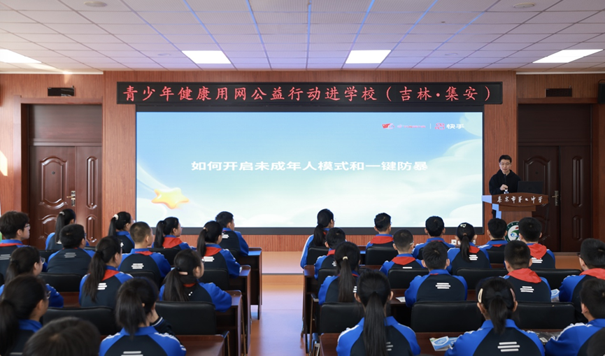 這場由共青團(tuán)中央宣傳部指導(dǎo),共青團(tuán)吉林省委主辦,共青團(tuán)集安市委承辦,快手作為戰(zhàn)略合作單位共同舉辦的“青少年健康用網(wǎng)公益行動(dòng)進(jìn)學(xué)?!被顒?dòng),旨在通過網(wǎng)絡(luò)安全教育,提升青少年網(wǎng)絡(luò)素養(yǎng),增強(qiáng)防范網(wǎng)絡(luò)暴力的意識(shí)與能力。近200名初一至初三的學(xué)生參加了這堂思政課。
