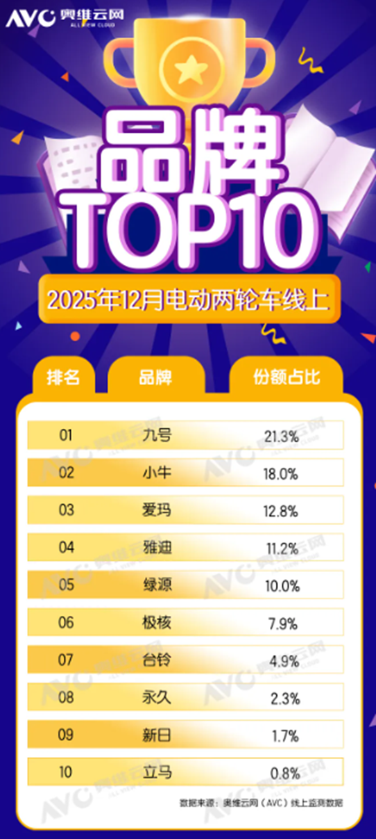 從奧維云網(wǎng)12月線上市場(chǎng)的熱銷(xiāo)車(chē)型榜單來(lái)看,設(shè)計(jì)和精準(zhǔn)卡位成了突圍關(guān)鍵,雅迪“摩登光芒”電摩靠高顏值復(fù)古設(shè)計(jì),以6.9%的份額領(lǐng)跑全場(chǎng)。愛(ài)瑪悠樂(lè)拿下3.8%的份額,位列第二。九號(hào)Fz3 110非常驚艷,新品剛發(fā)布就成功上榜,既證明了九號(hào)的品牌影響力,也凸顯了智能車(chē)型的市場(chǎng)爆發(fā)力。