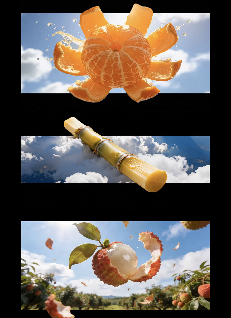 這種表達(dá)上的轉(zhuǎn)向,和他平時(shí)的觀看習(xí)慣有關(guān)。他提到,自己很喜歡看《舌尖上的中國(guó)》這類紀(jì)錄片,喜歡那種從勞作到收獲、從土地到餐桌的真實(shí)質(zhì)感。在他看來,很多傳統(tǒng)三農(nóng)視頻信息足夠直接,但畫面表達(dá)相對(duì)單一,更多是對(duì)著水果、作物和種植過程做講解。也正因?yàn)槿绱耍_始嘗試把 AI、轉(zhuǎn)場(chǎng)和鄉(xiāng)土題材結(jié)合起來,讓鄉(xiāng)村內(nèi)容在保留真實(shí)感的同時(shí),也有更強(qiáng)的視覺吸引力。