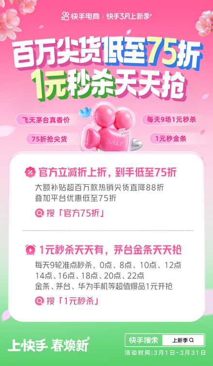 春煥新,購好物。3月1日,以“上快手 春煥新”為主題的快手3月上新季宣布正式開售,不僅有百萬尖貨破價直降88折、官方立減到手低至75折,還有大牌好貨1元秒殺,每天9輪天天開搶。據(jù)悉,此次快手上新季活動將貫穿整個3月,以更簡單直接的優(yōu)惠玩法和豐富的尖貨好物,和用戶共同開啟春日煥新購物季。