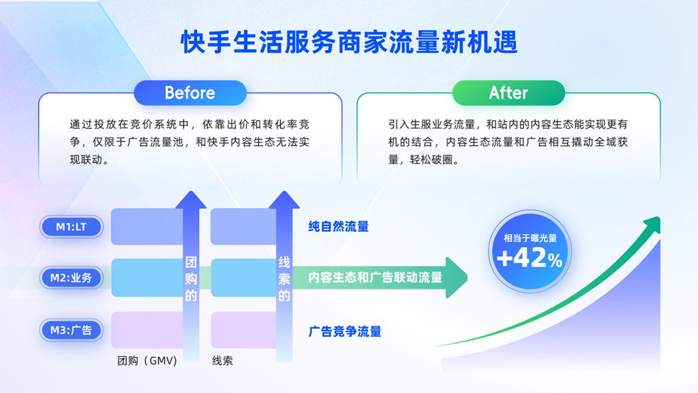 2026年3月,快手生活服務(wù)將推出「全域流量」模式,為助力商家高效獲客,創(chuàng)新性地引入生活服務(wù)流量,打破自然流量與商業(yè)流量的邊界,以商家在快手全站流量中的線索價值最大化為目標(biāo),幫助商家獲取額外曝光、優(yōu)化流量結(jié)構(gòu),從而提升線索轉(zhuǎn)化效率與整體ROI,更好地滿足商家經(jīng)營需求。