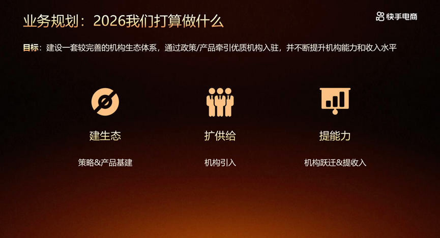 本次會議,快手電商正式發(fā)布電商機(jī)構(gòu)「啟源計劃」扶持方案。啟源計劃的第一項重要內(nèi)容是將電商機(jī)構(gòu)劃分更加清楚。今年快手電商通過發(fā)布啟源計劃,將從機(jī)構(gòu)分型到資源權(quán)益分層都進(jìn)行明確的劃分,將什么類型的機(jī)構(gòu)應(yīng)該走哪條扶持路徑講清楚,包括對公司的利好、資源的匹配,都提供得更精準(zhǔn),幫助機(jī)構(gòu)成長更清晰。