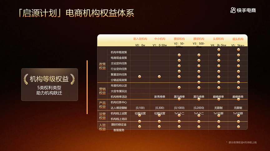 通過啟源計劃的發(fā)布,快手電商平臺提供給機(jī)構(gòu)眾多的經(jīng)營權(quán)益:
